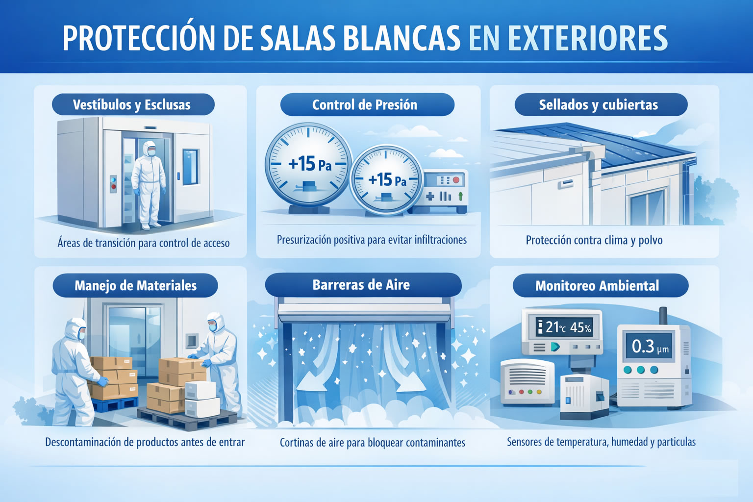 Para comprender mejor cómo se organiza y protege una sala blanca en exteriores, presentamos un diagrama resumen con las principales medidas: