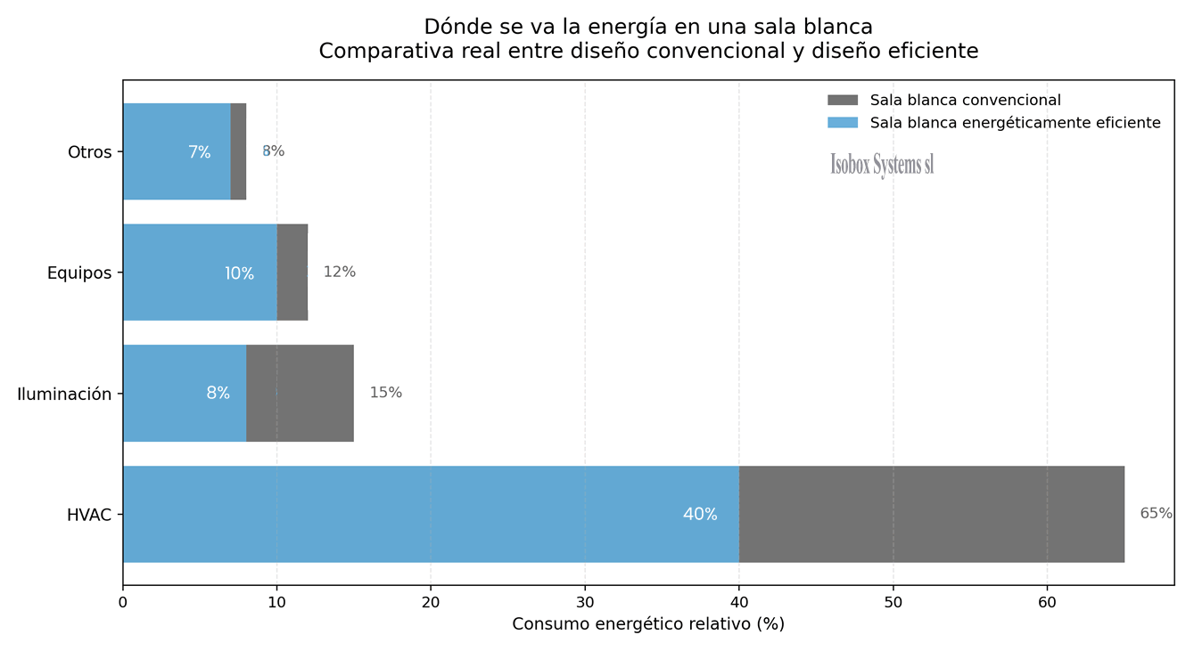 Una sala blanca típica puede consumir entre 30 y 100 veces más energía que un edificio convencional debido, principalmente, a los sistemas de climatización que mantienen altos caudales de aire, filtros de alta eficiencia y condiciones ambientales estrictamente controladas durante las 24 horas del día. En muchos casos, más de 50-75% del consumo eléctrico total de una sala blanca se asigna al sistema HVAC (Heating, Ventilation and Air Conditioning).
